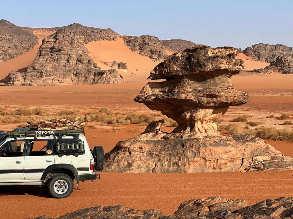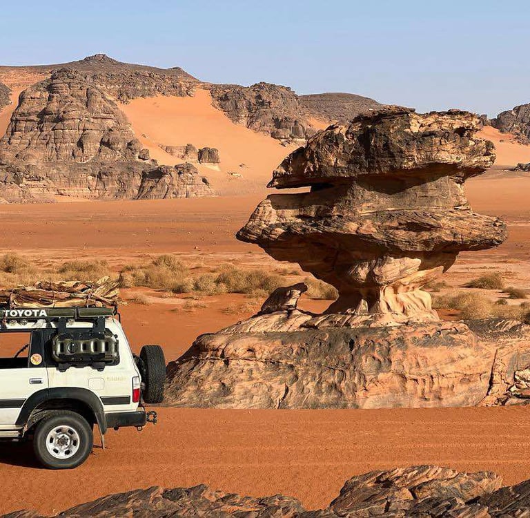 Tadrart, located in the the UNESCO World Heritage site of Tassili n'Ajjer, is a stunning desert destination known for its dramatic landscapes and ancient history. Visitors are captivated by its towering red sand dunes, like those at Tin Merzouga, winding canyon networks, and striking rock formations shaped by the wind over millennia. The area is also home to an incredible array of prehistoric rock art, with thousands of petroglyphs and cave paintings depicting ancient wildlife and early human life. Whether you’re exploring the dunes, marveling at the unique geology, or uncovering the stories etched into the rocks, Tadrart offers an unforgettable journey into the heart of the Sahara.